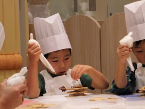 さっき模ったチョコクッキーが焼きあがってきました。これにピンク・白・黄・緑で色付けしていきます。指導のお姉さんが、次のように指示します。