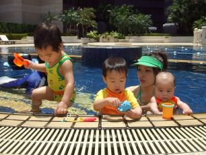 10時半に、長女家族が当ホテルにやって来て、プールに繰り出しました。天気も良く、泳ぐのに最適の気候です。子供達は大はしゃぎ・・・と思いきや、リュウは、最初は水に慣れなくて、「イヤ、イヤ〜」を連発。でも、だんだんに怖さもなくなって、やっと入れるようになりました。でも、パパ達が・・・とても楽しそうに、もぐったり、泳いだり、騒いだりしていました。