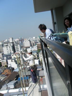 今日は、南面バルコニー側の足場の解体作業です。昨夕に、12階まで解体が進んでいたので、今日は11階の部分からです。コーヒーを飲んでいた私は、早速にベランダから乗り出して、写真撮影に没頭(必死)。覗きこむだけで、おそろしや〜〜ぁ!!